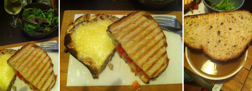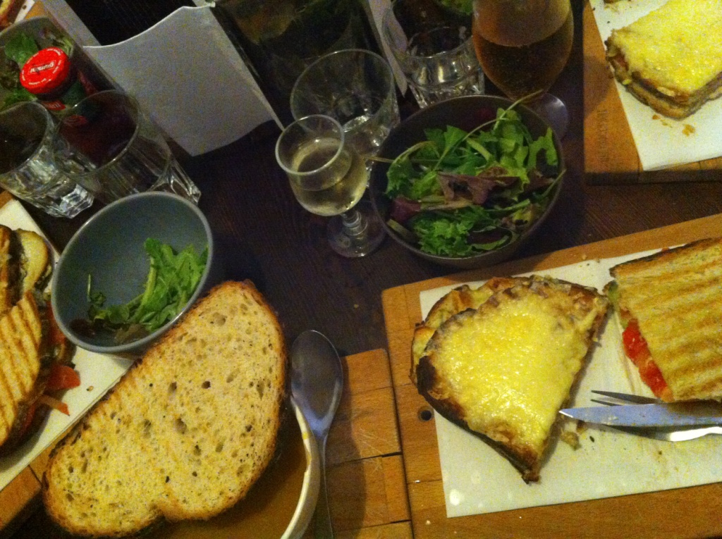 Des apéros qu’on ne voit nulle part ailleurs, mélangeant vin et liqueurs, des planches de saucisson ou autres terrines pour grignoter un verre à la main, en attendant son plat, des tartines, surtout, et des tartines encore. Froides ou chaudes selon l’envie du jour. Au fromage, au jambon, aux légumes, et même au foie gras… J’ai bon souvenir de la version 3 fromages et poire, mais aussi de celle plus classique tomate mozza pesto et encore, puisque c’est celle que j’ai pris cette fois-ci, de celle au chèvre et au miel. Le pain reste bien moelleux, le fromage est bien fondu, les saveurs sont bien relevées. La petite salade est en supplément mais l’addition ne devrait tout de même pas vous effrayer ! On s’est même payé le luxe de tester les desserts avec notamment un joli tiramisu au spéculoos, plutôt régressif dans sa présentation ! Je vous le disais, ici, on se croirait encore étudiants, et ça a du bon !