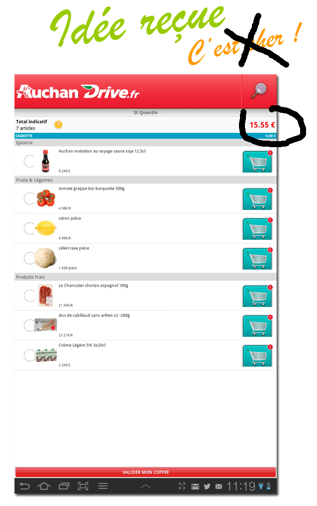 Si j’achète (à peu près) tous les ingrédients fournis dans le kit que j’ai pu tester (le plat à base de cabillaud) sur le site de Auchan Drive, j’en ai pour un peu plus de 15€. Et il faut que je me déplace pour aller chercher le tout.