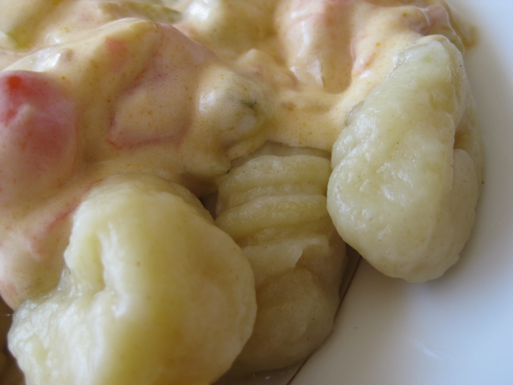 De mon côté, j’ai servi ces gnocchi maison avec une sauce à la crème et aux tomates et courgettes. Et c’était plutôt sympa d’avoir conservé le côté un peu croquant de la courgette avec le moelleux des gnocchi. Par contre, je pense que pour la prochaine fois, je les ferai un peu plus petits (comme ils se servent en Italie d’ailleurs).