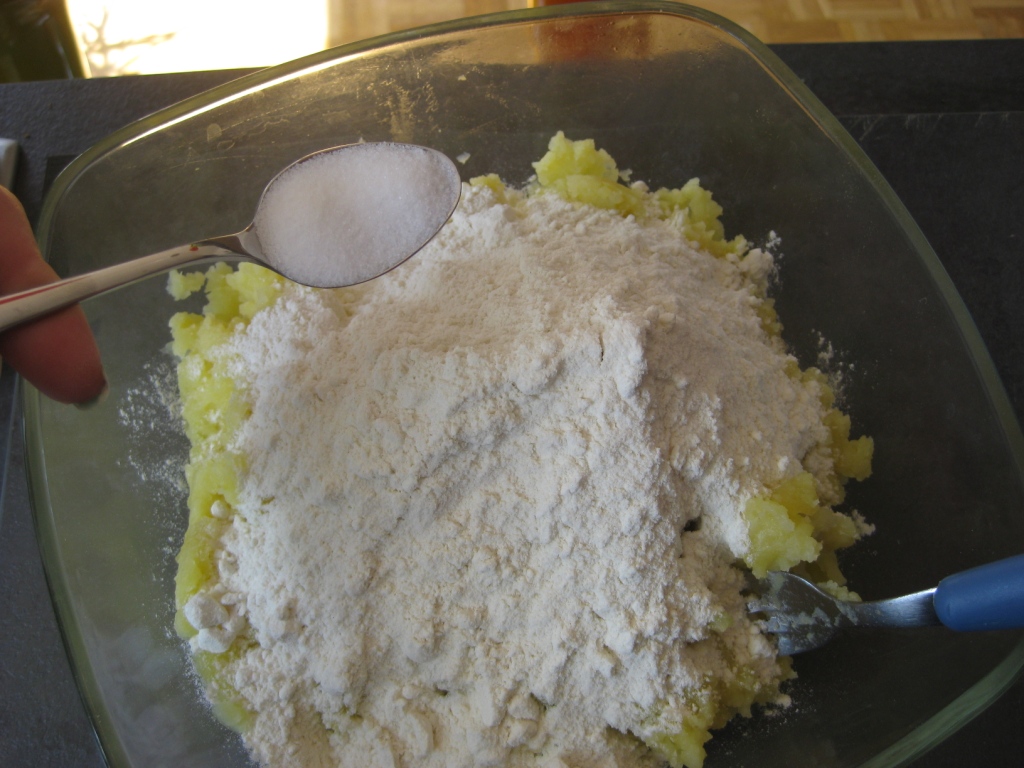 • Ajouter un jaune d’oeuf à la purée, 1,5 cuillère à café de sel et 150g de farine (Attention, je pense que cette quantité est à adapter selon vos pommes de terre. Aussi, préférez peut-être commencer par un peu moins et ajoutez-en au fur et à mesure si besoin).