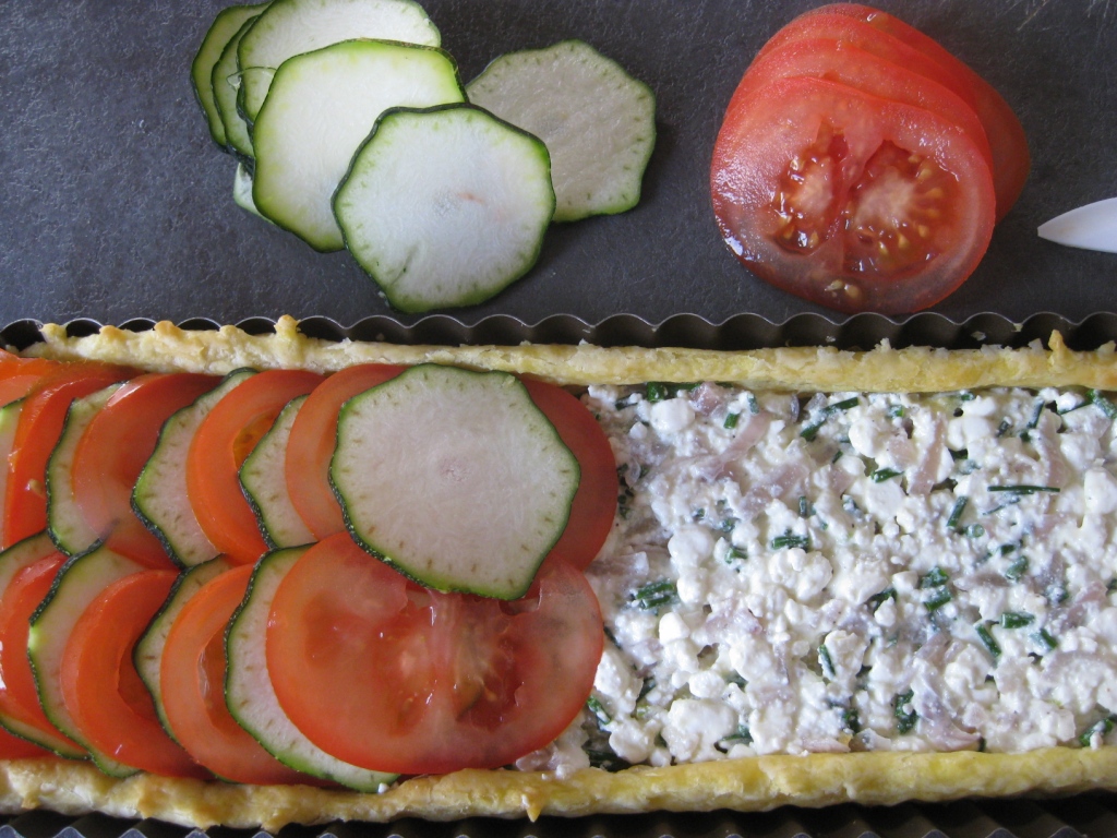 • Couper en rondelles 2 tomates et 1 courgette. Recouvrir la tarte en intercalant une rondelle de tomate et une rondelle de courgette.