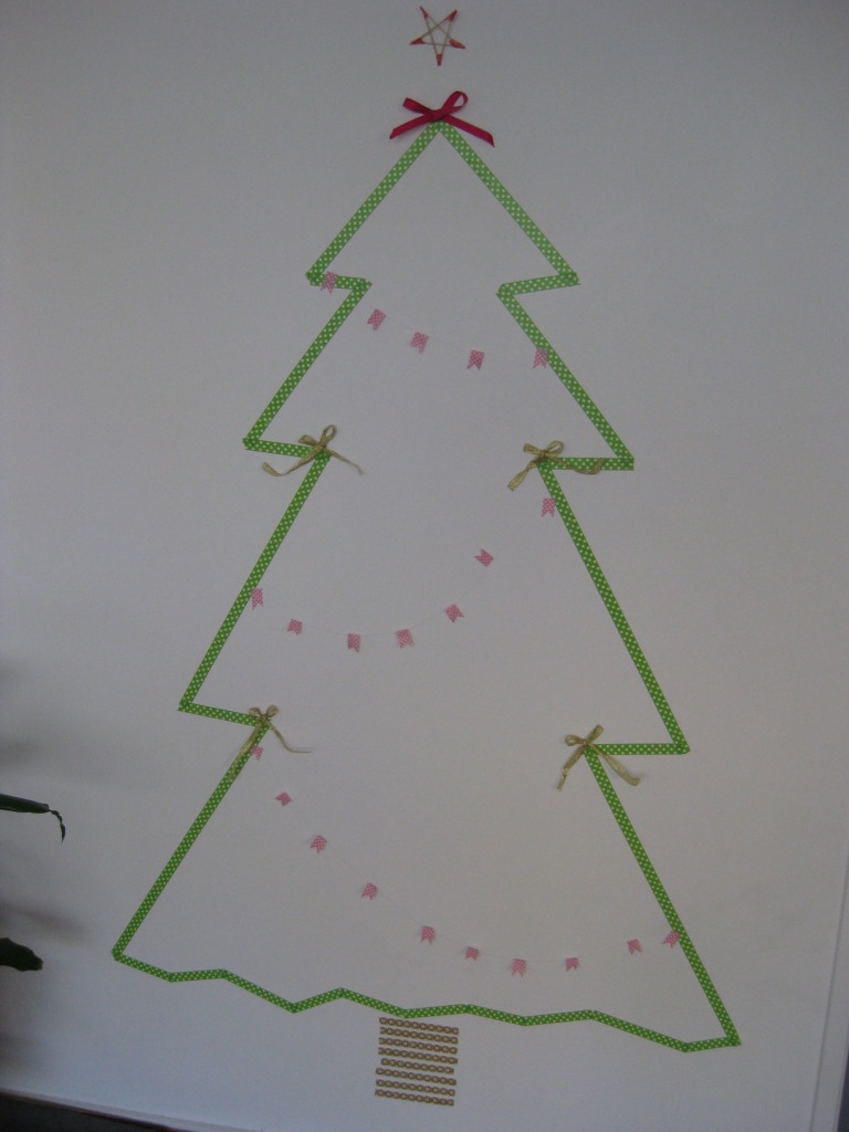 Tout est accroché à l’aide de Masking tape ou de gomme fixe pour les nœuds. Dans quelques semaines, je peux donc retirer tout ça tranquillement sans la moindre trace sur mon mur ! Et d’ici là, je vais profiter à fond de mon premier sapin d’appartement home made ! Alors, certes, je n’ai pas la douce odeur de sapin qui fait plaisir en rentrant dans mon salon, mais 1 ou 2 bougies allumées vont vite remplacer ce manque. Et au moins, aucune épine par terre, ni aucune place de perdue dans ma pièce ! La solution idéale, non ?