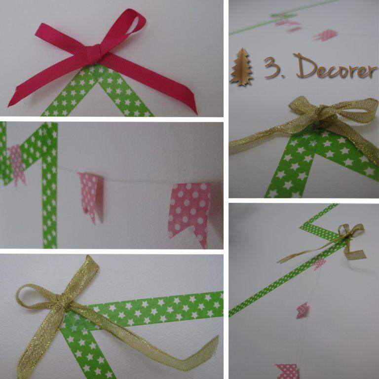 - Puis décorer à sa guise ! Pour ma part, j’ai installé un nœud rose au sommet pour faire ressortir un peu l’ensemble. Quelques nœuds dorés sur les branches. Et bien sûr quelques guirlandes. Guirlandes de fanions en Masking tape rose. Et la touche finale : une petite étoile en haut !