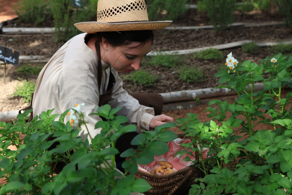 Accueillies comme des reines, nous avons été rhabillées de la tête aux pieds. Histoire de crédibilité en ramassant les quelques herbes aromatiques ? Je ne crois pas… mais le ridicule ne tuant pas, c’est avec plaisir qu’on se prête au jeu et se retrouve donc en tenue de jardiniers du XVIIIème siècle (à la façon Tom Sawyer pour certaines…) : un grand tablier, une darne, un chapeau de paille, et un joli panier en osier.
