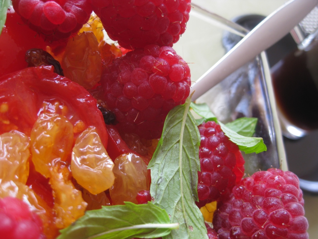 Douceur de tomates rôties, raisins golden et framboises