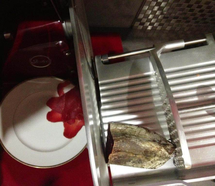 • Deuxième obligation (du moins, nous nous plaisons à croire que cela en est une) : avoir une trancheuse, pour trancher la mocetta, c’est bien plus facile ! (mais sinon en vrai vous prenez un bon couteau et je pense que vous devriez vous en sortir, même si ce sera certainement légèrement moins régulier, cela prendra aussi légèrement moins de place dans votre cuisine… (mais ça fera aussi moins parler !)).