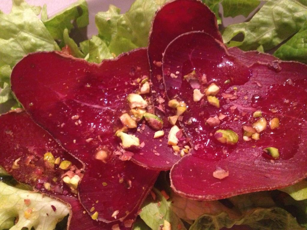 • Bref, après avoir tranché 8 belles tranches de mocetta (pour 2), vous lavez 1 salade que vous coupez un peu avant de la répartir dans de grandes assiettes et vous placez la mocetta.