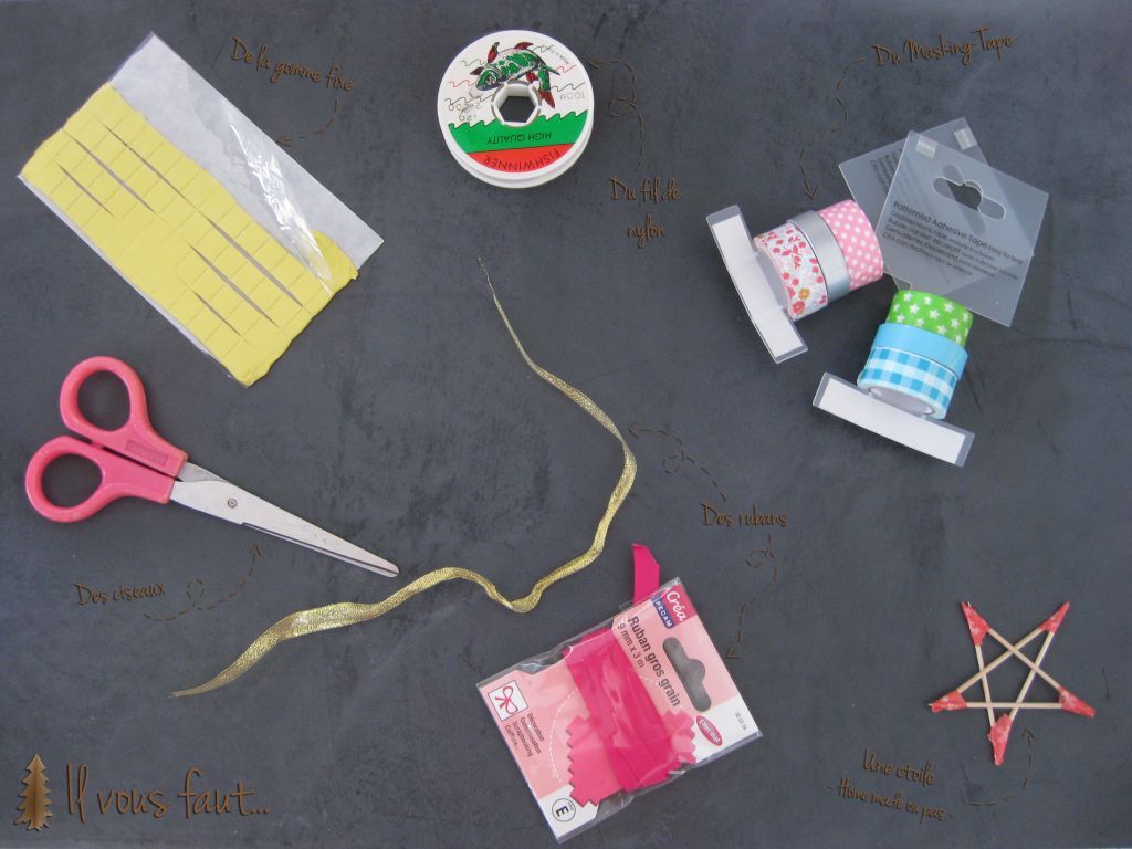 Sur la liste, rien de bien compliqué : quelques rouleaux de Masking tape (selon vos envies de couleurs / déco complémentaires), des ciseaux, du ruban, de la gomme fixe pour éviter d’abîmer votre mur et éventuellement une jolie étoile, ici home made aussi à l’aide de cure-dents et Masking tape encore.