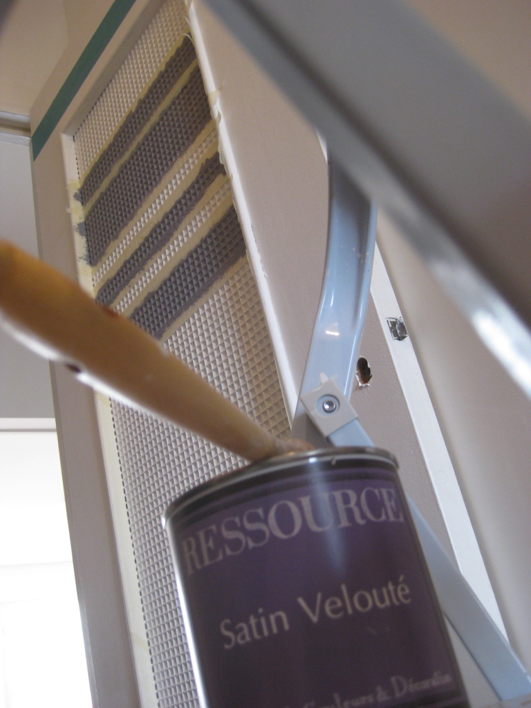 Bon, alors, je vous arrête tout de suite : même si je suis plutôt contente du résultat, je vous déconseille fortement de vous lancer dans la peinture d’une telle vitre “gaufrée” ! En effet, vous pouvez imaginer que le pinceau ne va pas vraiment partout et qu’au final, le geste à effectuer est plutôt celui utilisé pour faire un pochoir. En gros, j’ai du tamponner pendant des heures et des heures pour bien couvrir la surface… Une horreur !!