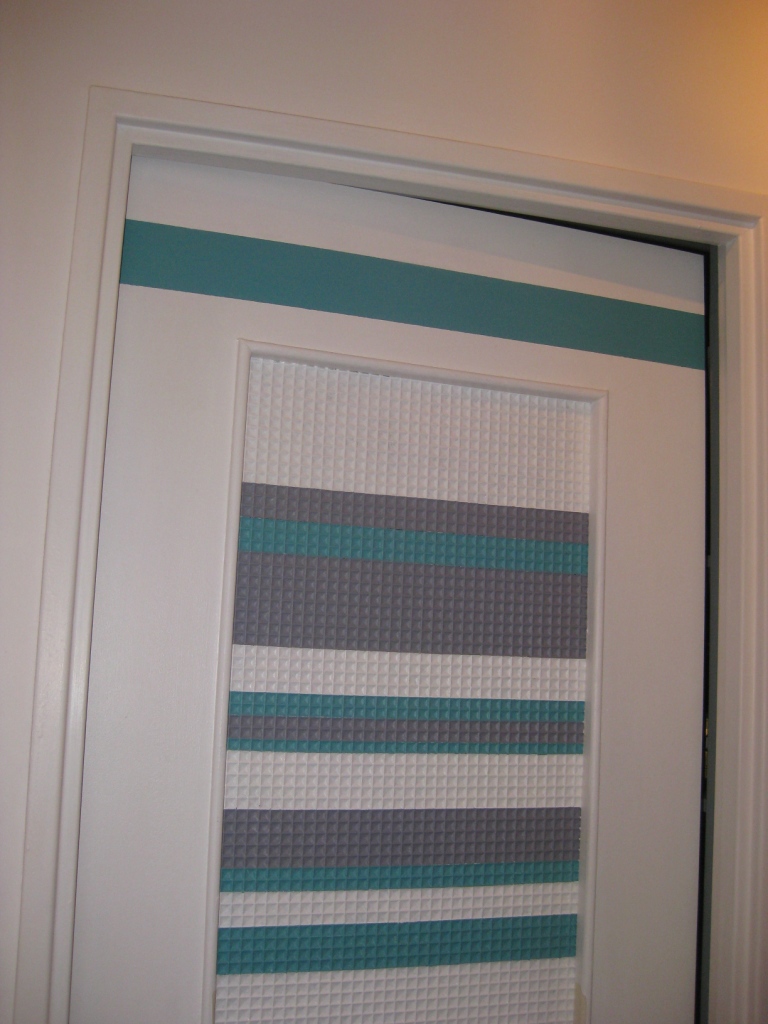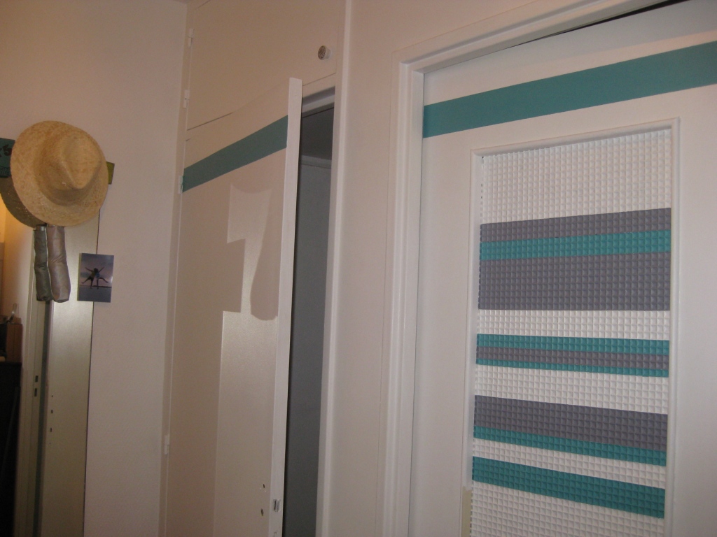 Alors, j’ai longuement hésité à la forme de mes bandes : devraient-elles sortir de la vitre justement pour en oublier sa présence ? Devraient-elles aller plus bas sur la porte ? (car oui, on ne voit pas sur la photo, mais le reste de la porte est totalement blanc – et oui par contre, on le voit bien : j’avais oublié de retirer tout le scotch sur le côté bien trop pressée de prendre ma photo !).